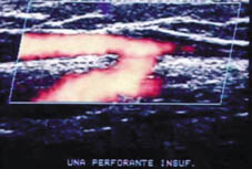 Se aprecia vena perforante que comunica venas gemelares con el sistema
